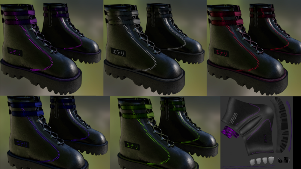 A pair of cool easily customizable boots perfect for use in VRChat. They are rigged and come with an armature. Should fit the Pandaa base nicely but also any other humanoid base.